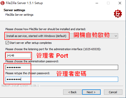 是否同意所有Windows 用户登入时都启动此服务,因为我只有一位管理者使用者,所以我会使用预设。默认即可