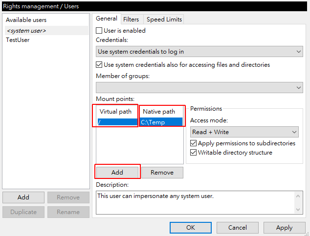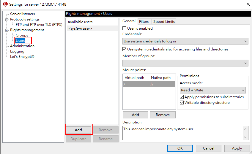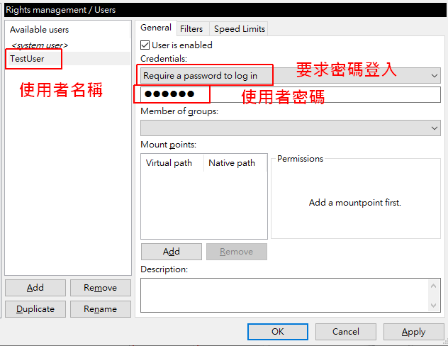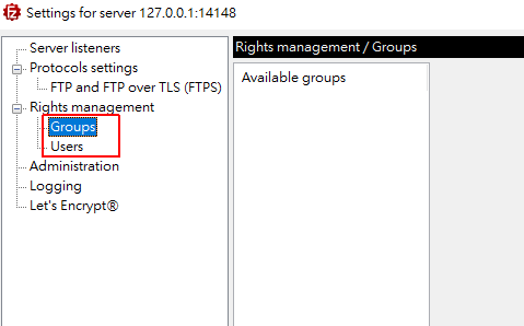 在Rights management 底下有群组和使用者的选单。groups群组可以不用管