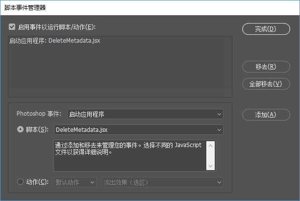 当然,这么浅显的解决思路一定有大神已经实现了,利用 PhotoShop 的脚本事件功能,就能自动清理文件中的“文档来源”数据: